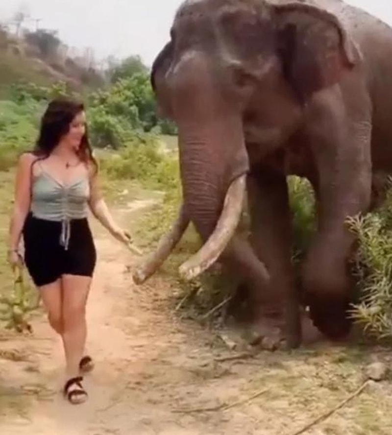 O sırada kadın geri doğru giderken fil de onu takip etti. Gülümseyen kadın, hiç beklemediği bir şekilde dev hayvanın saldırısına uğradı.