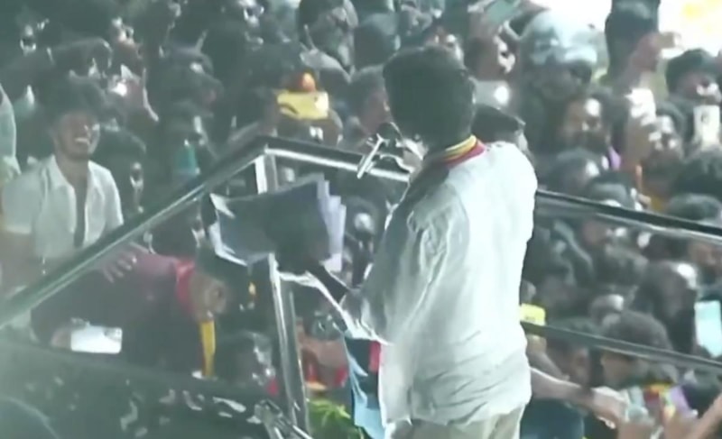 Durumun ciddiyetini fark eden Vijay ise konuşmasını yarıda keserek kalabalığa sakin olmaları çağrısında bulundu ve alanı terk etti.