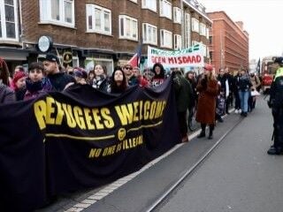"Dünya herkesin", "sınırları açın", "sınıra hayır, ulusalcılığa hayır, sürgünü durdur" ve "mültecilere kapımız açık" sloganları atan göstericiler, Langen Beestenmarkt sokağındaki çocuk parkına yürüdü.