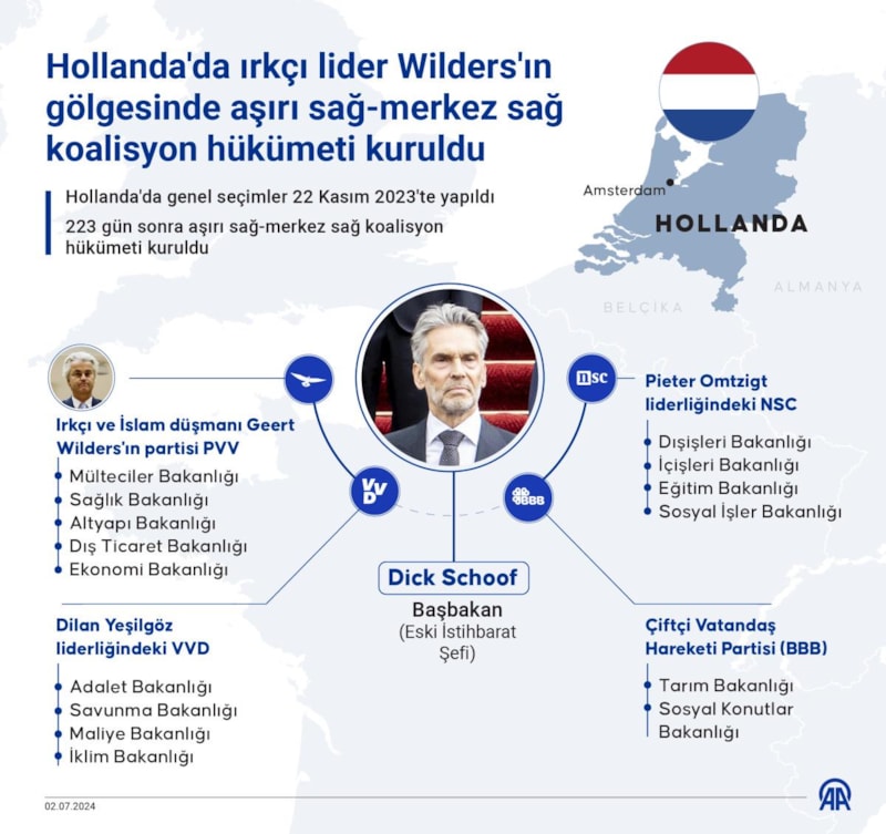 Hollanda'da 22 Kasım 2023'te yapılan genel seçimlerden 223 gün sonra ırkçı ve İslam düşmanı lider Geert Wilders'ın ilk günden itibaren tek seçenek olduğunu söylediği aşırı sağ-merkez sağ koalisyon hükümeti kuruldu.