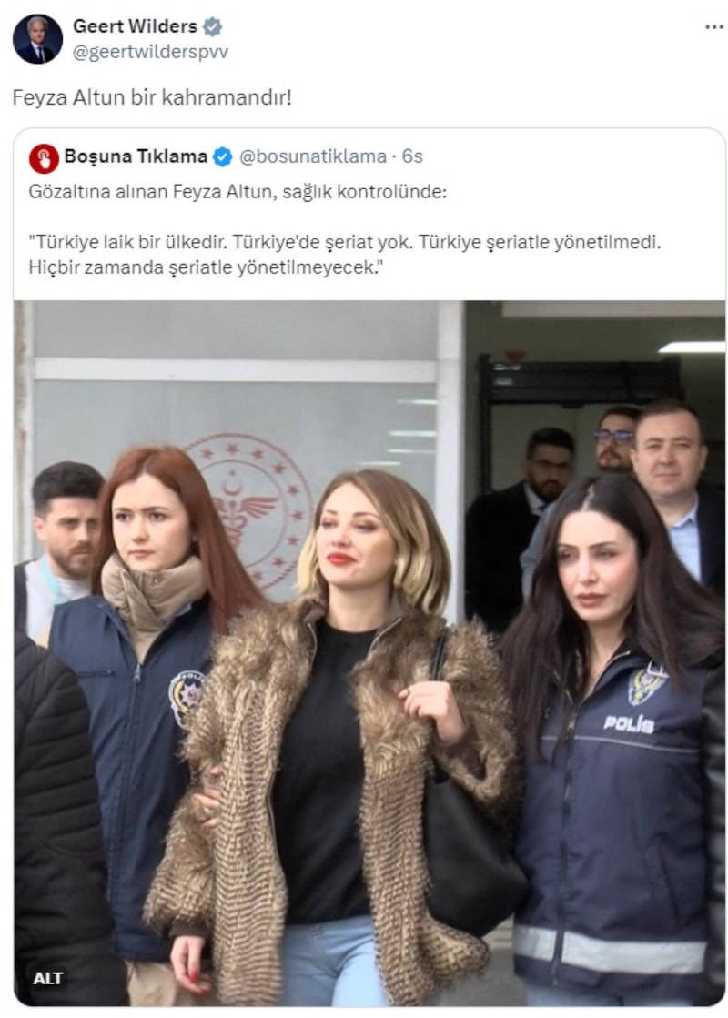 Sosyal medya hesabından Altun'un fotoğrafını paylaşan Wilders, "Feyza Altun bir kahramandır!" notunu düştü.