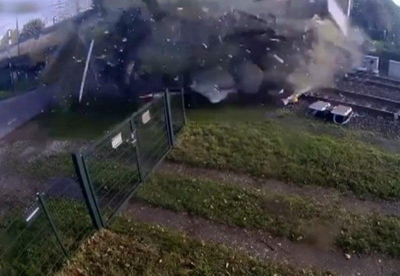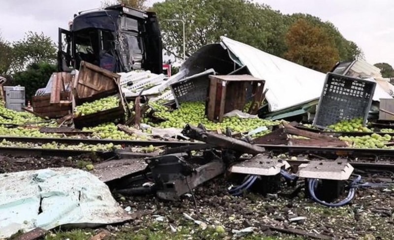 Hollanda'da hemzemin geçitte geri manevra yapan armut yüklü tıra yolcu treni çarptı. O anlar anbean kameraya yansırken 5 kişi yaralandı.