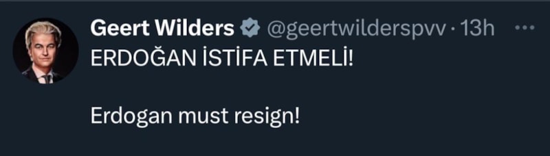 Wilders, resmi X hesabından yaptığı paylaşımda "Erdoğan istifa etmeli" dedi.