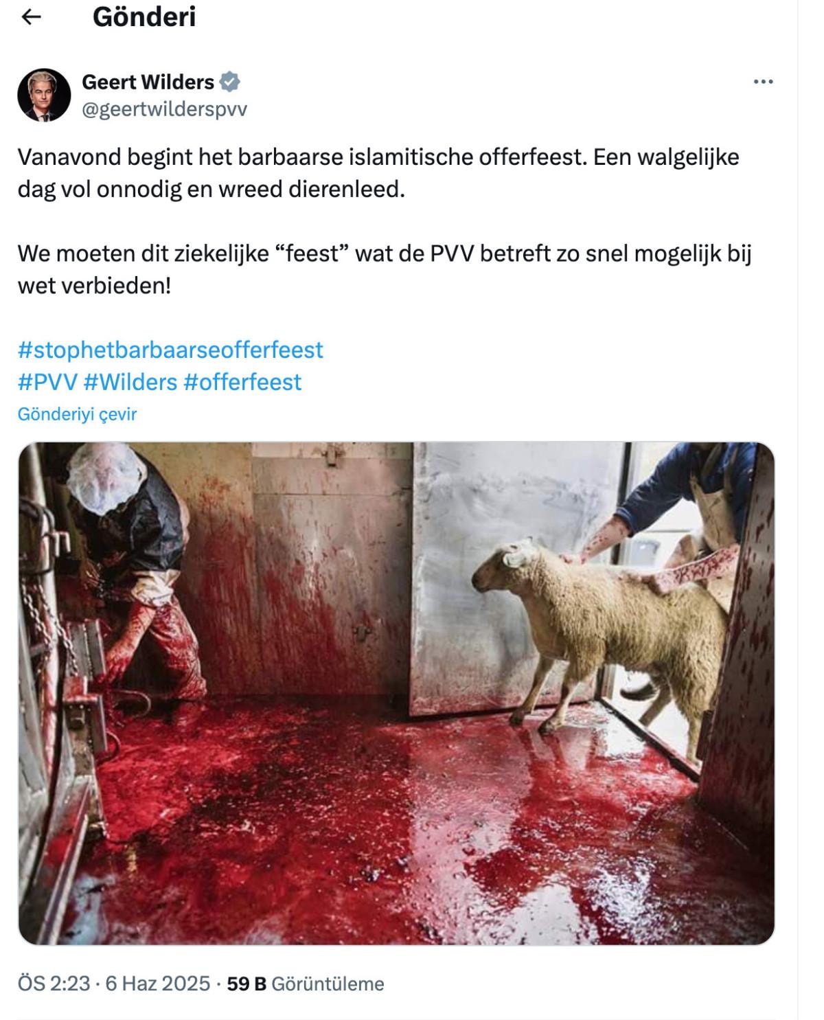 Sosyal medya hesabından paylaşımda bulunan Wilders, Kurban Bayramı'nın "barbarca" olduğunu söyledi.