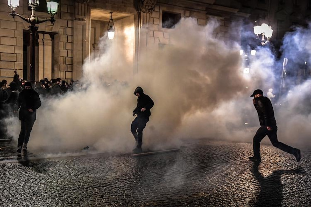 Göstericiler çöp konteynerleri, bisiklet ve scooterları ateşe verdi, polis karşıtı sloganlar attı.