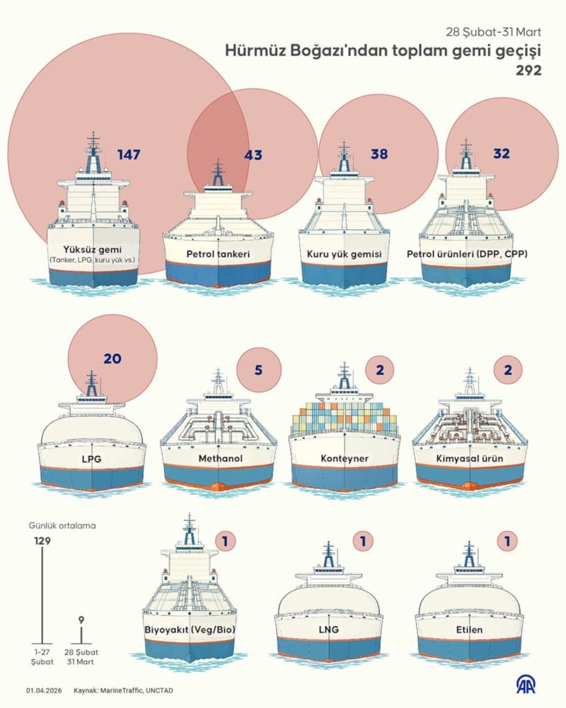 İran'ın ABD ve İsrail'in saldırılarına karşı misilleme olarak kapattığı Hürmüz Boğazı'nda durgunluk devam ederken boğazdan 28 Şubat-31 Mart arasında geçen 292 ticari geminin, 147'sinin boş olduğu aktarıldı.