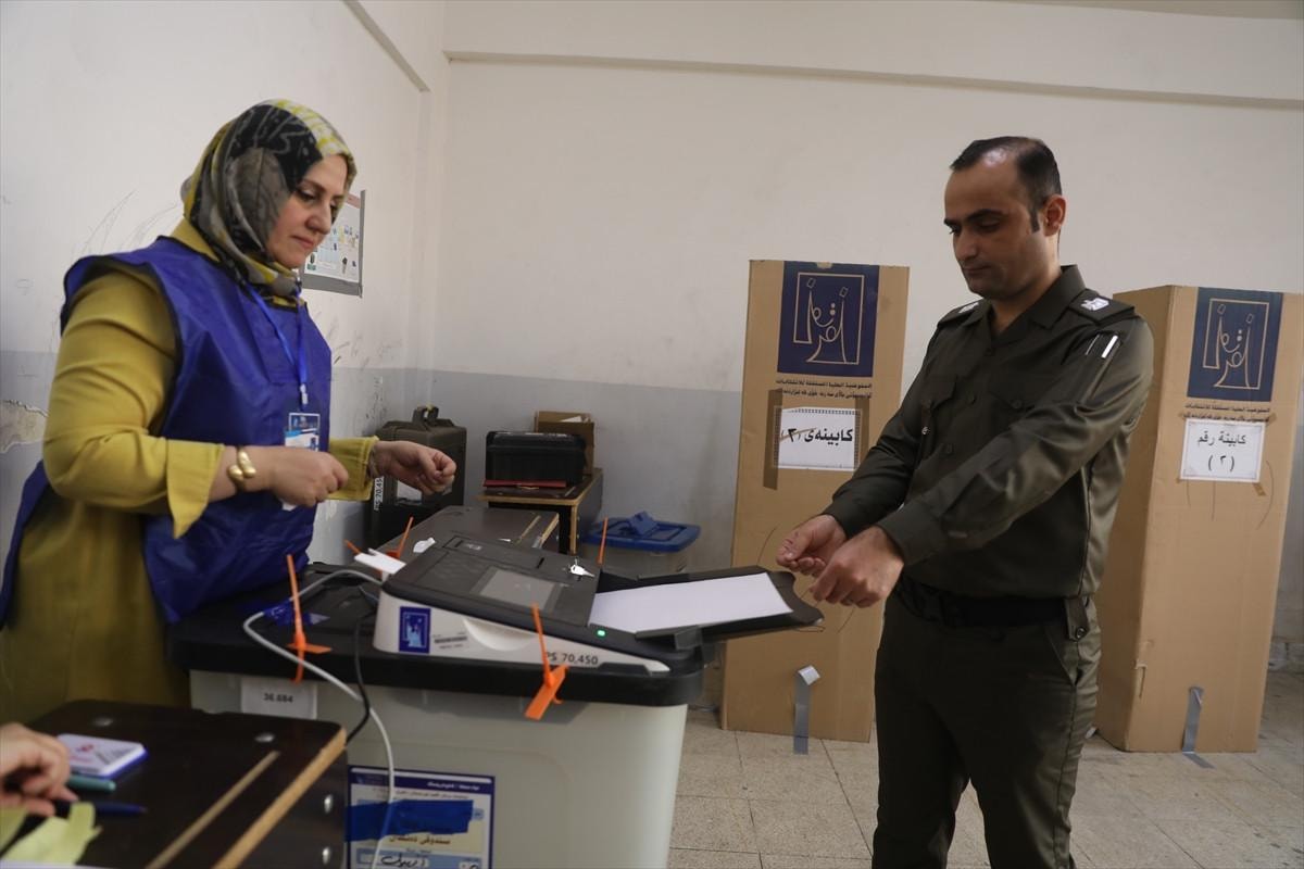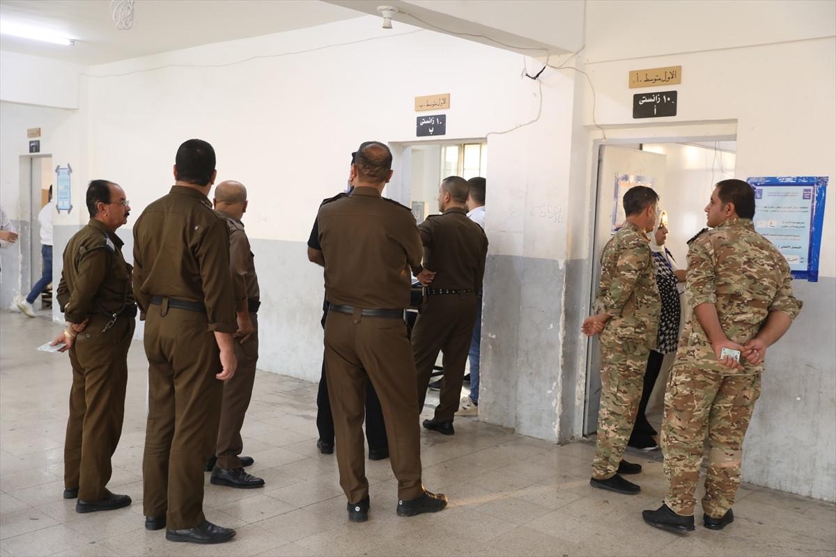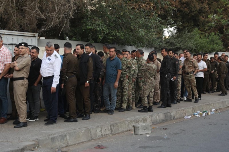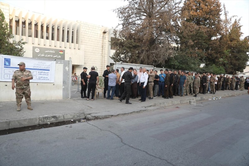 Süleymaniye kentindeki güvenlik güçleri, oy kullanmak için seçim merkezi önünde sıra bekledi.