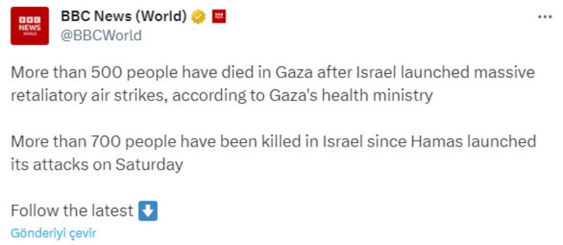 7 Ekim'den bu yana gerilimin devam ettiği İsrail-Filistin hattında, çok sayıda can kayıpları yaşanmaya devam ediyor. İngiliz yayın kuruluşu BBC, Gazze'de hayatını kaybedenler için 'ölenler' derken, İsrail'de hayatını kaybedenler için ise 'öldürülenler' ifadesini kullandı.