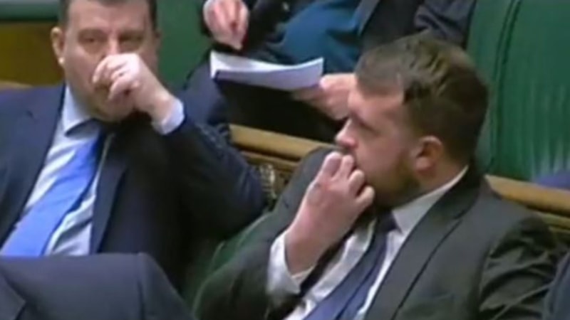 Barclay'in konuşması esnasında kameraya yansıyan anlarda, Muhafazakar Parti milletvekili Jonathan Gullis'in el tırnaklarını yediği görüldü.