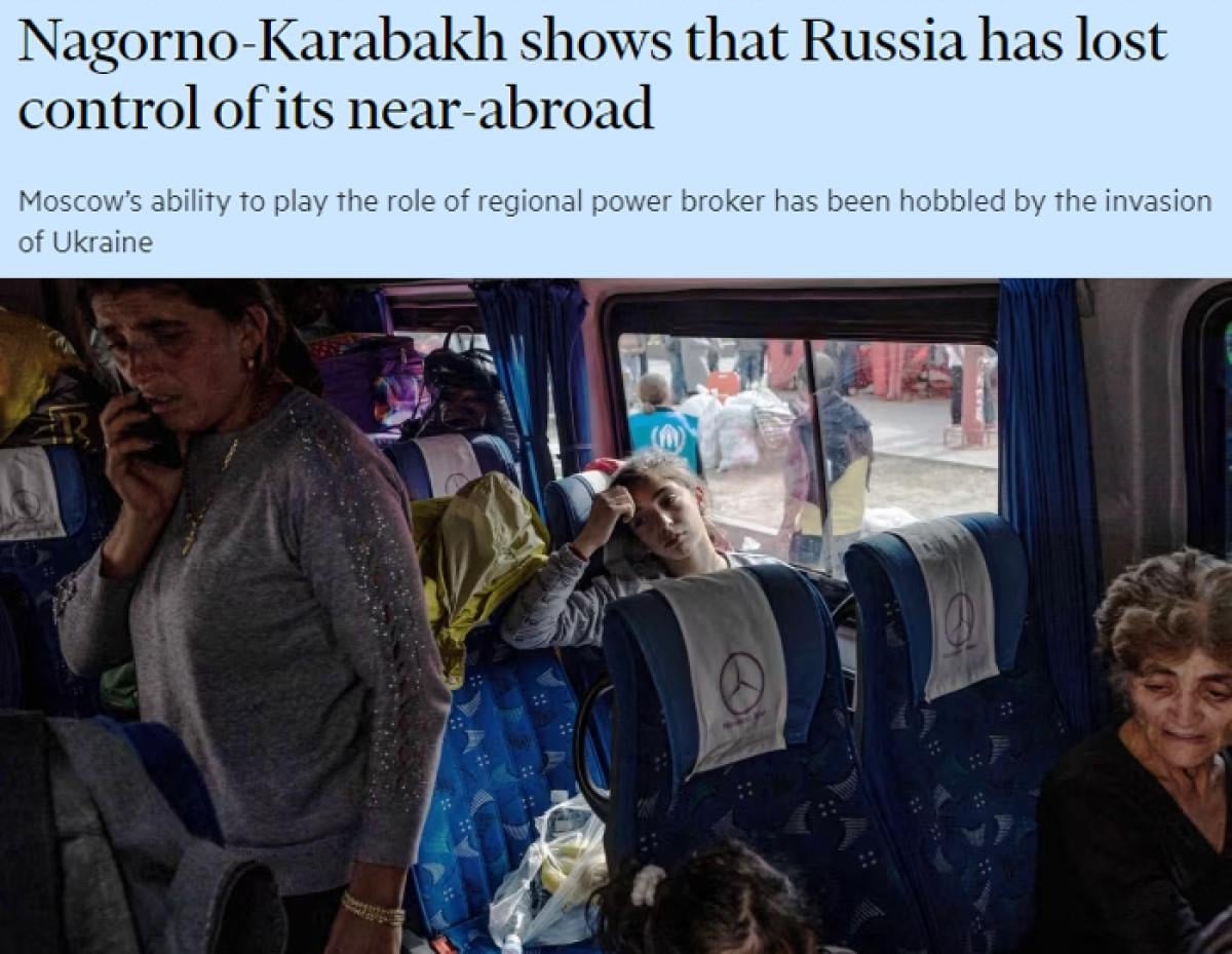 Financial Times'ın "Dağlık Karabağ, Rusya'nın yakın çevresindeki kontrolünü kaybettiğini gösteriyor" başlıklı yazısında, Moskova'nın bölgesel güç rolünü oynama yeteneğinin, Ukrayna savaşı nedeniyle mümkün olmadığı belirtildi.