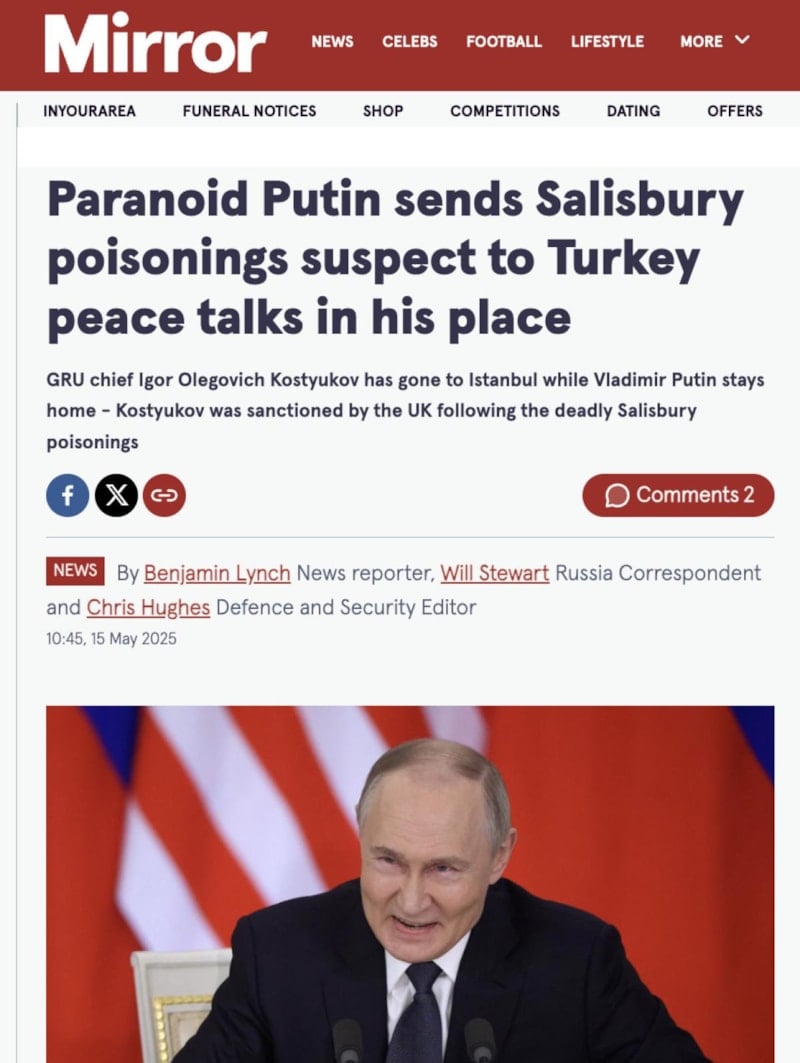 The Mirror gazetesi, Rusya lideri Putin’in Türkiye’deki barış zirvesine, Ukrayna lideri Zelensky ile yüzleşmekten ve suikasta uğramaktan korktuğu için katılmadığını yazdı.