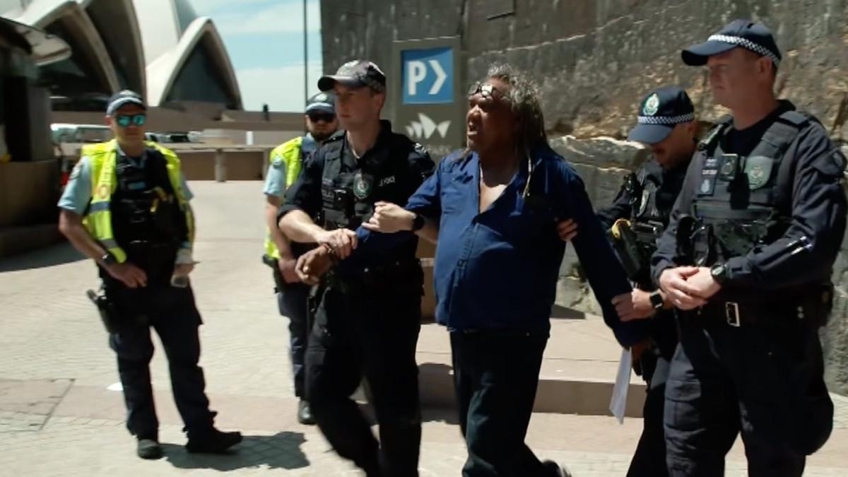 Aborjin protestocu Wayne Wharton, Kraliyet'in ziyareti öncesi, kral ve kraliçeyi görmek isteyen kalabalığa karşı durarak monarşi karşıtı sloganlar attı.