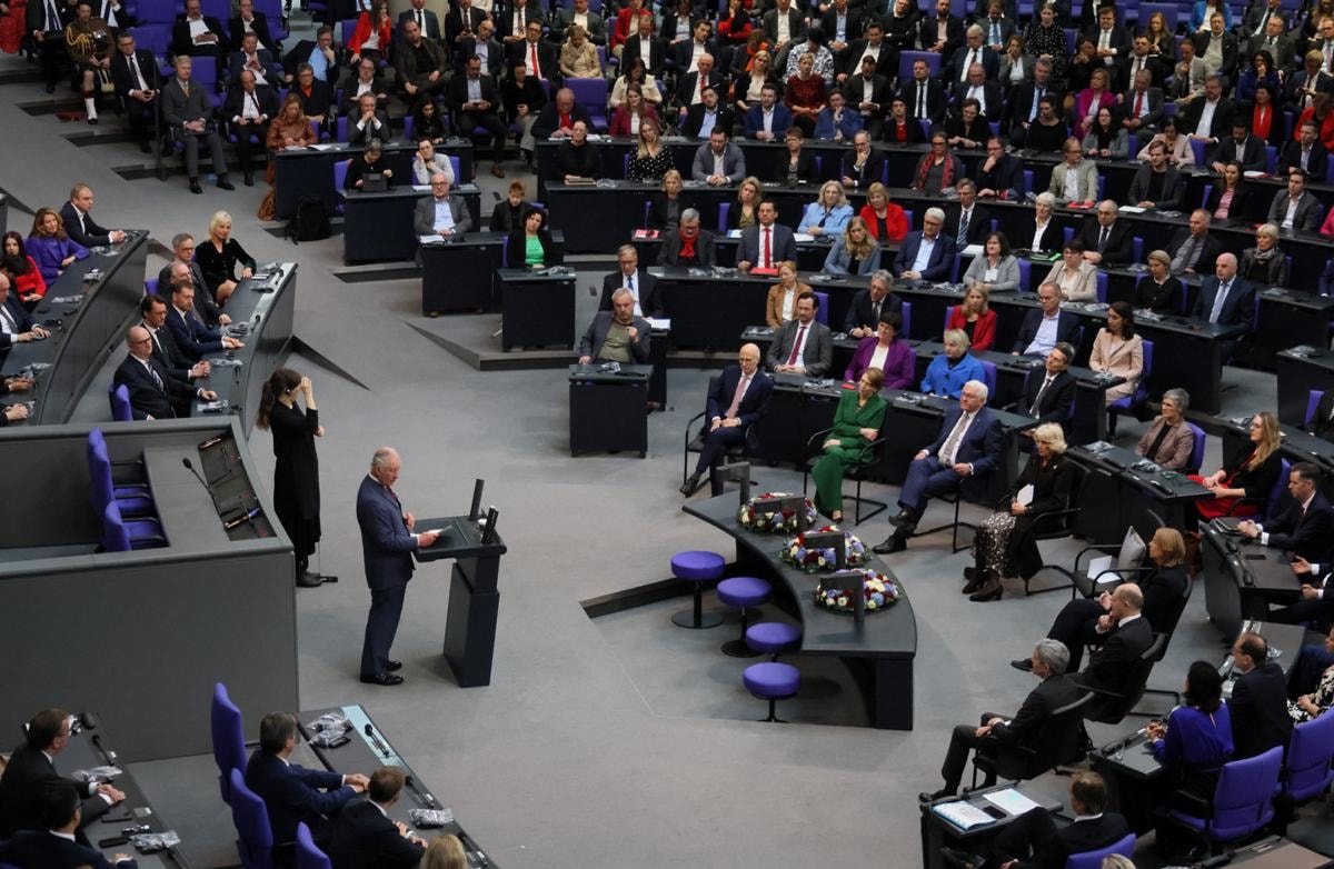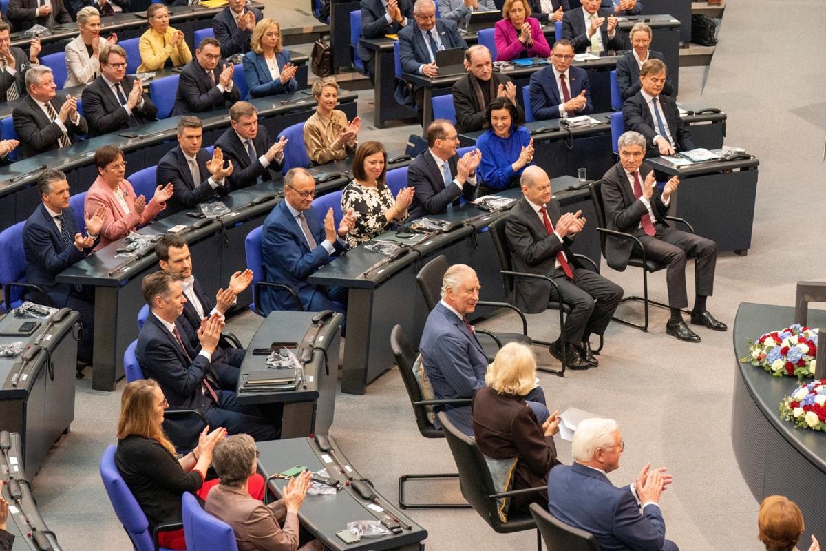 Federal Meclis'te milletvekillerinin yanı sıra Almanya Cumhurbaşkanı Frank-Walter Steinmeier, Başbakan Olaf Scholz, bakanlar ve anayasal kurumların başkanları yer alırken eski Almanya cumhurbaşkanları Christian Wulff ve Joachim Gauck, Kral Charles'in konuşmasını dinleyici tribününden izledi.
