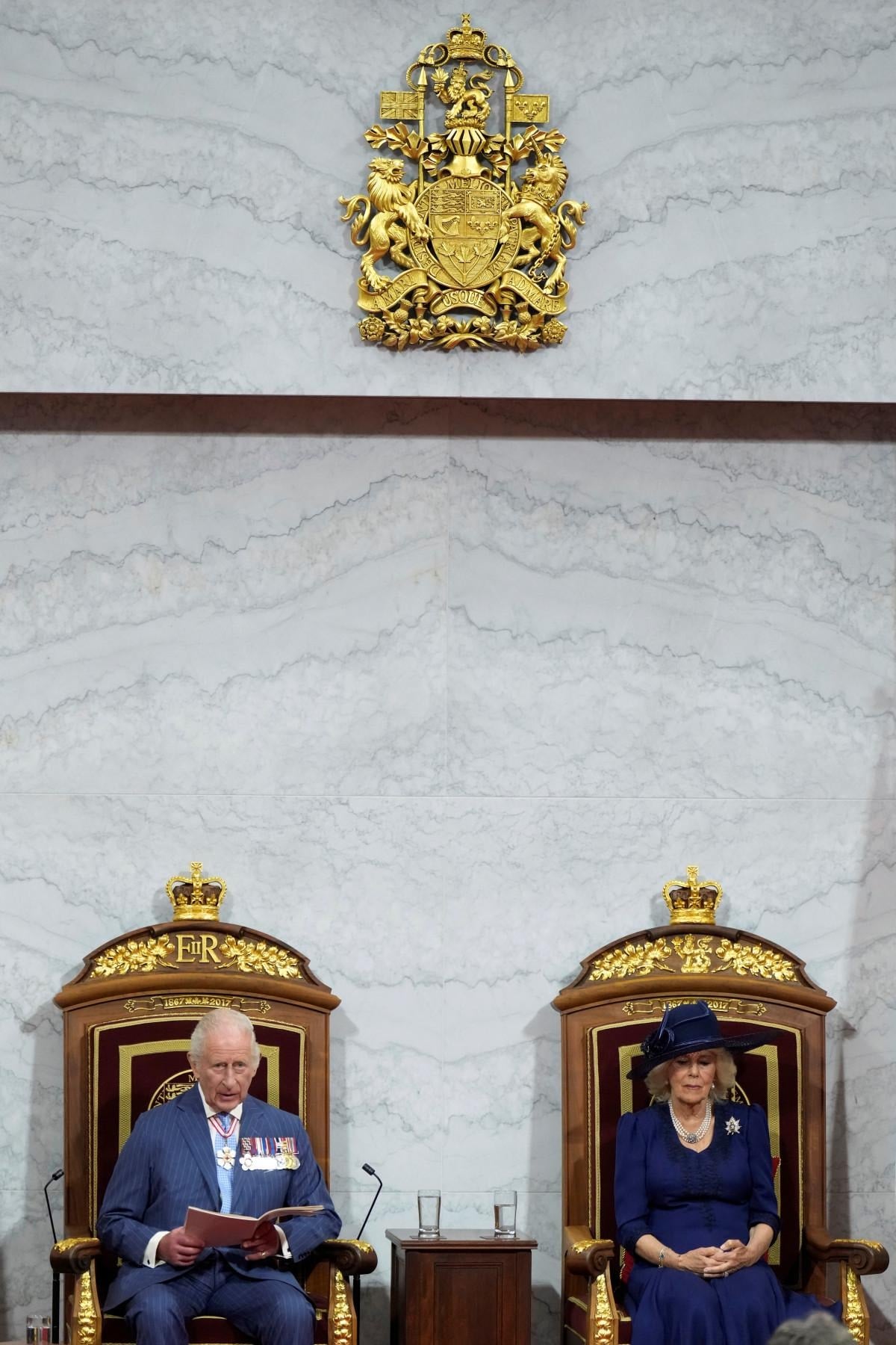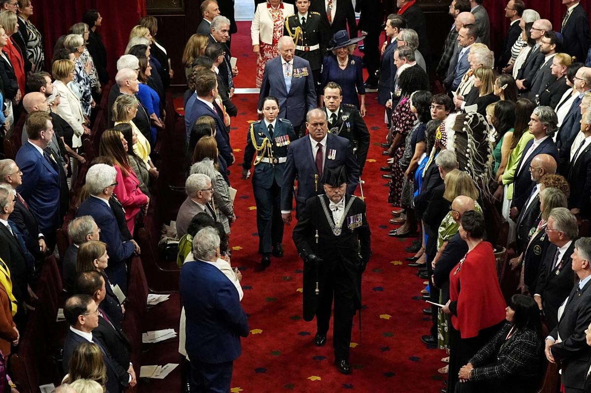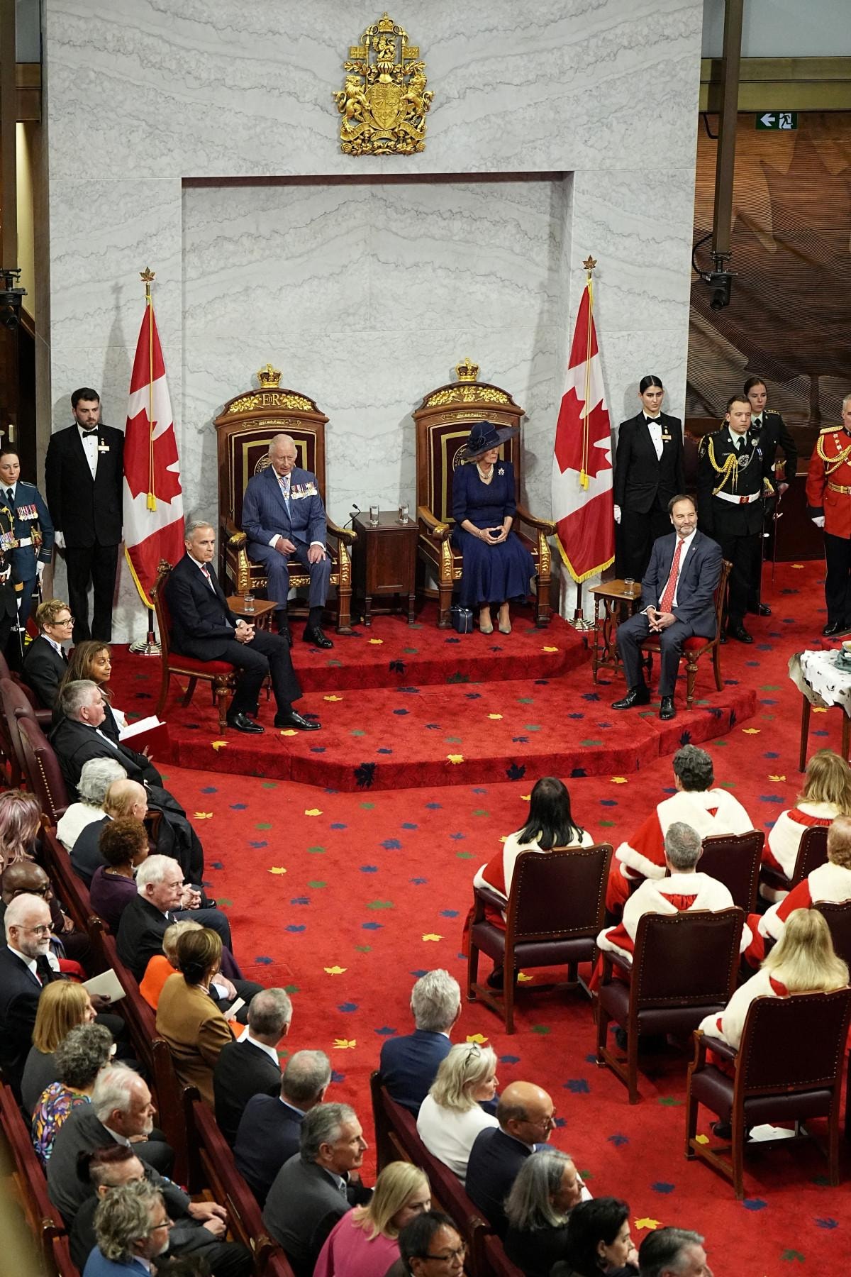 İngiltere Kralı unvanının yanı sıra İngiliz Milletler Topluluğu (Commonwealth) bölgesinin kralı olması nedeniyle resmi olarak Kanada Kralı makamının da sahibi olan Kral Charles, parlamentoda Kraliçe Camilla ile birlikte Kral ve Kraliçeye ayrılan tahta oturdu.