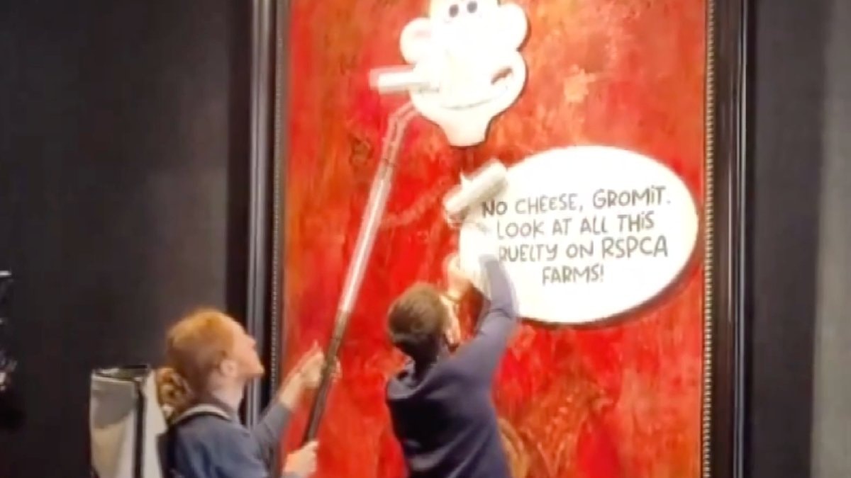 Aktivistler, "Wallace ve Gromit" çizgi filminin ana karakterlerinden Wallece'ın yüzünün bulunduğu etiketi Kral Charles'ın yüzüne, tabloya da “Gromit, Kraliyet Hayvanlara Karşı Zulmü Önleme Derneği (RSPCA) çiftliklerinde hayvanlara yapılan zulme bak" yazılı konuşma balonu yapıştırdı. Aktivistler, RSPCA çiftliklerinde bulunan hayvanlara yapılan zulme dikkati çekmek istediklerini ifade etti.