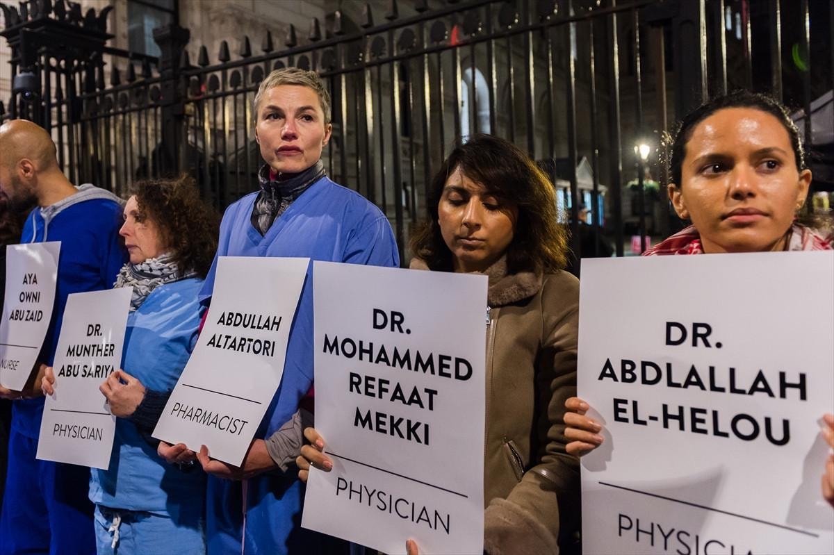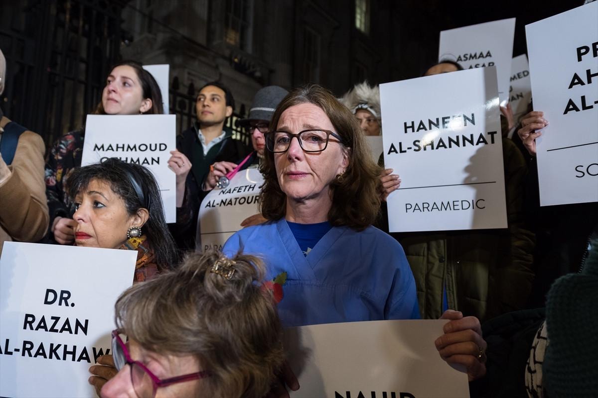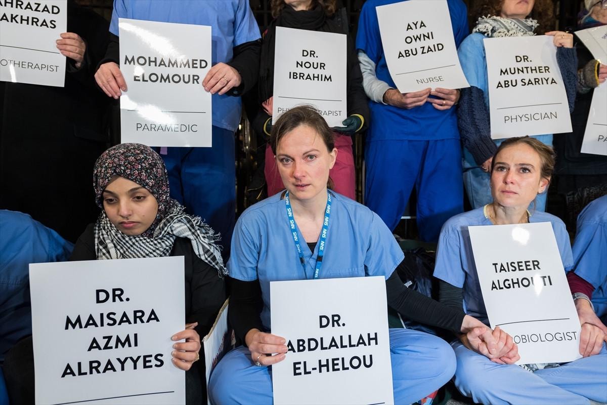 İngiltere başta olmak üzere ABD ve Kanada gibi farklı ülkelerde görev yapan çok sayıda doktor, hemşire ve sağlık görevlisi, çeşitli uluslararası sağlık örgütlerinin öncülüğünde Londra'daki Başbakanlık binası önünde bir araya gelerek, ellerinde İsrail'in Gazze'deki saldırılarında hayatını kaybeden meslektaşlarının isimlerinin ve ünvanlarının yazılı olduğu pankartları taşıdı.