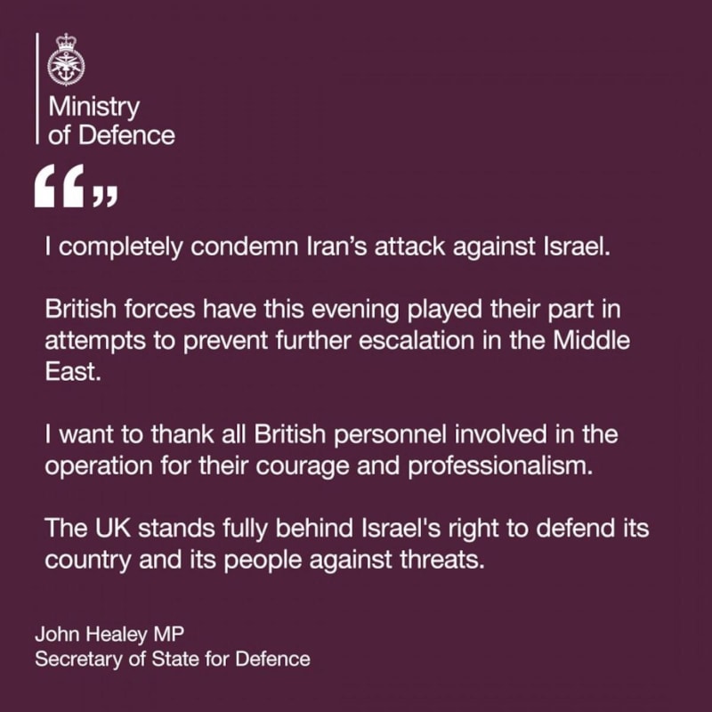 İran’ın İsrail’e yönelik saldırılarını kınayan Healey, “İngiliz kuvvetleri bu akşam Orta Doğu’da gerilimin daha da tırmanmasını önleme çabalarında rollerini oynamıştır” ifadelerini kullandı.