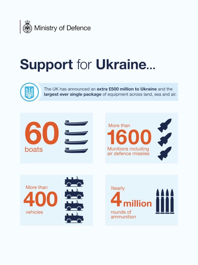 Bugün açıklanan 500 milyon pound tutarındaki ek fon, acil ihtiyaç duyulan mühimmat, hava savunma, insansız hava araçları ve mühendislik desteğinin hızla sağlanması için kullanılacak. Droneler İngiltere’den satın alınacak ve fonlar, yurt içi savunma tedarik zincirlerinin büyütülmesini destekleyecek.