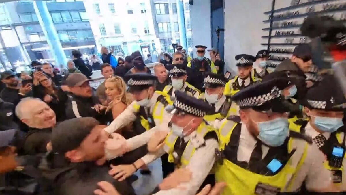 Geride bıraktığımız haftalarda BBC binasına girmeye çalışan aşı karşıtları, bu kez ITV ve TRT World gibi birçok medya kuruluşuna ev sahipliği yapan binaya baskın düzenledi.