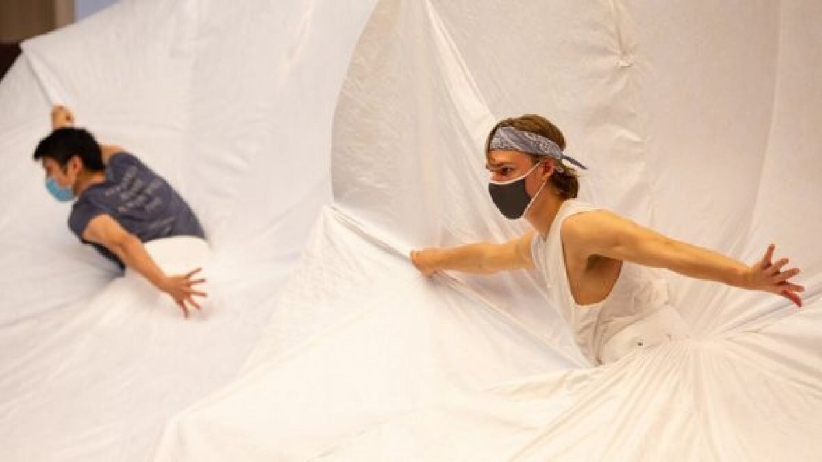 Balet Acosta, sosyal mesafeli tütü için “Başladığımızda, kimsenin birbirine dokunmayacağı bir kıyafet istedik ve böylece dansçılar statik olmayan ancak sürekli hareket eden ve farklı şekiller yaratan uzun kıyafetler giyecekler.” dedi.