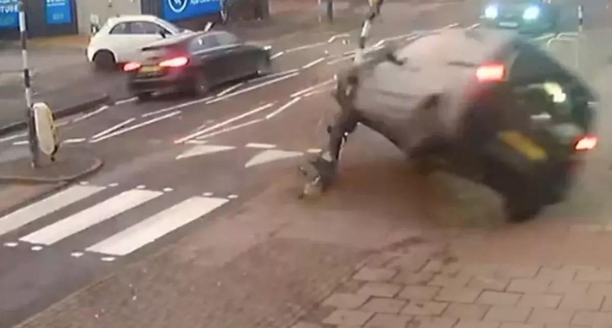 Batı Midlands bölgesinde yaşanan kazada, bebeğiyle birlikte yolda ilerleyen kadın, kontrolden çıkan aracı son anda fark etti.