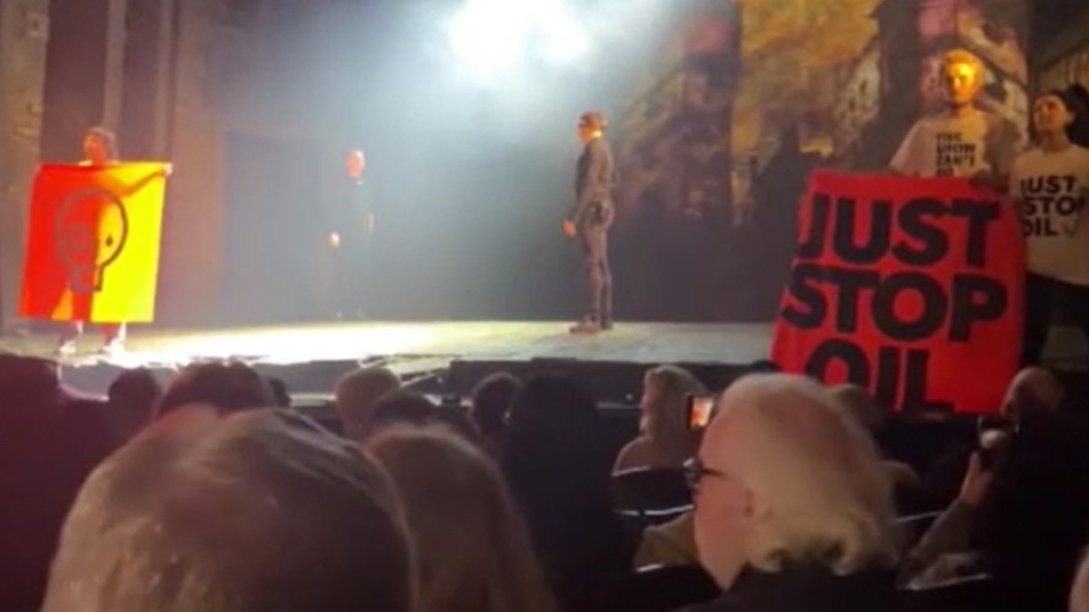 Çevreci grup Just Stop Oil, müzikali yarıda kesip sahneye çıkarak pankart açtı.