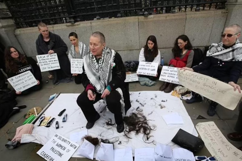 Parlamento binası önünde saçlarını kazıyanlar, Filistin ve Gazze'deki kadınlarla dayanışma mesajı verdi. Göstericiler, "Onları duyduğumuzun farkında olsunlar" dedi.