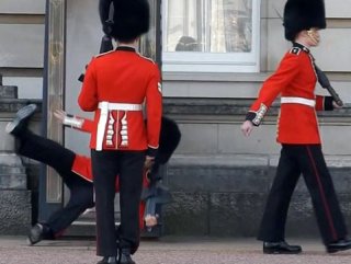 İngiltere'de Kraliçe Elizabeth'in yaşadığı Buckingham Sarayı önünde nöbet tutan kırmızı üniformalı askerlerden biri, nöbet değişimi sırasında ayağı kayarak yanlamasına yere kapaklandı.