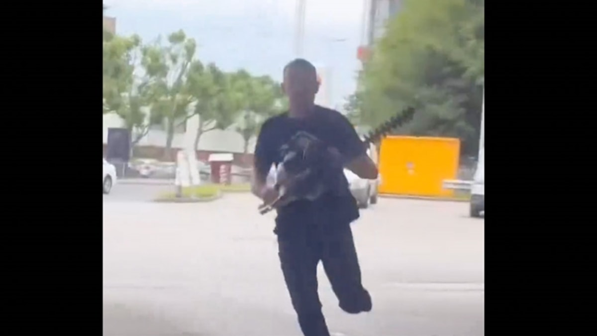Sosyal medyada paylaşılan görüntülerde, benzin istasyonundaki bir kişinin, arabasına koşarak elektrikli budama testeresi aldığı görüldü.
