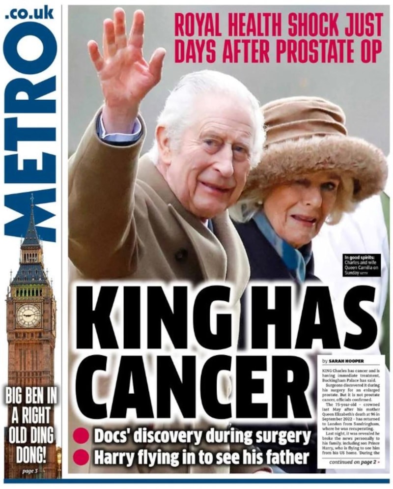 Kral Charles'ın eşi Kraliçe Camilla ile fotoğrafını tam sayfa yayınlayan Metro, "Kraliyet'e sağlık şoku... Kral kanser" manşetini attı.