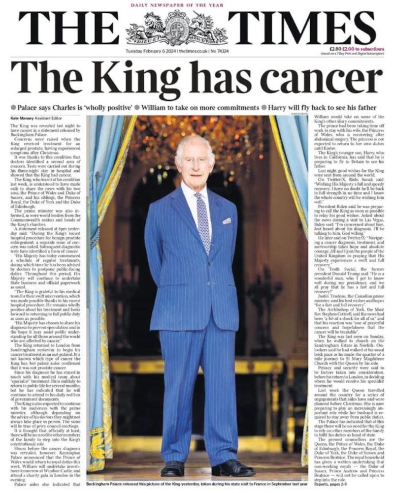 Kral'ın kansere yakalandığını duyuran The Times, Buckingham Sarayı'ndan yapılan açıklamaya işaret ederek, Charles'ın "tam anlamıyla pozitif" olduğunu yazdı.
