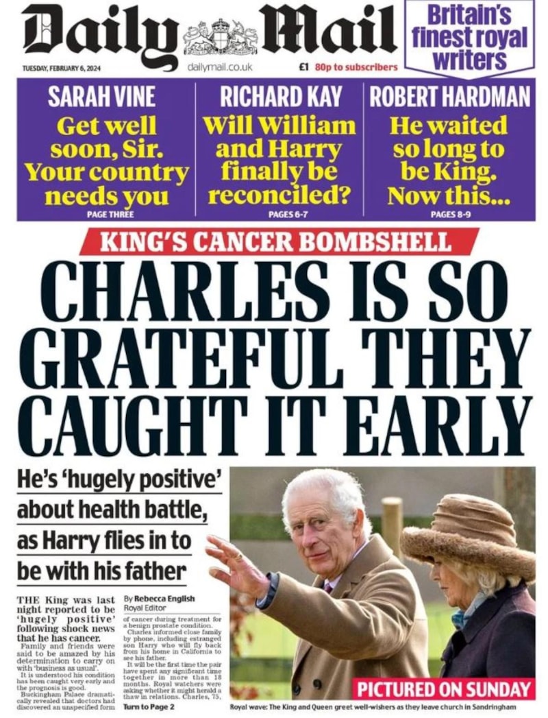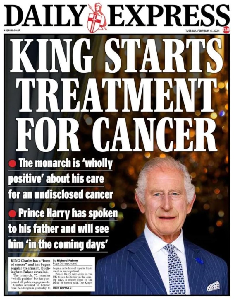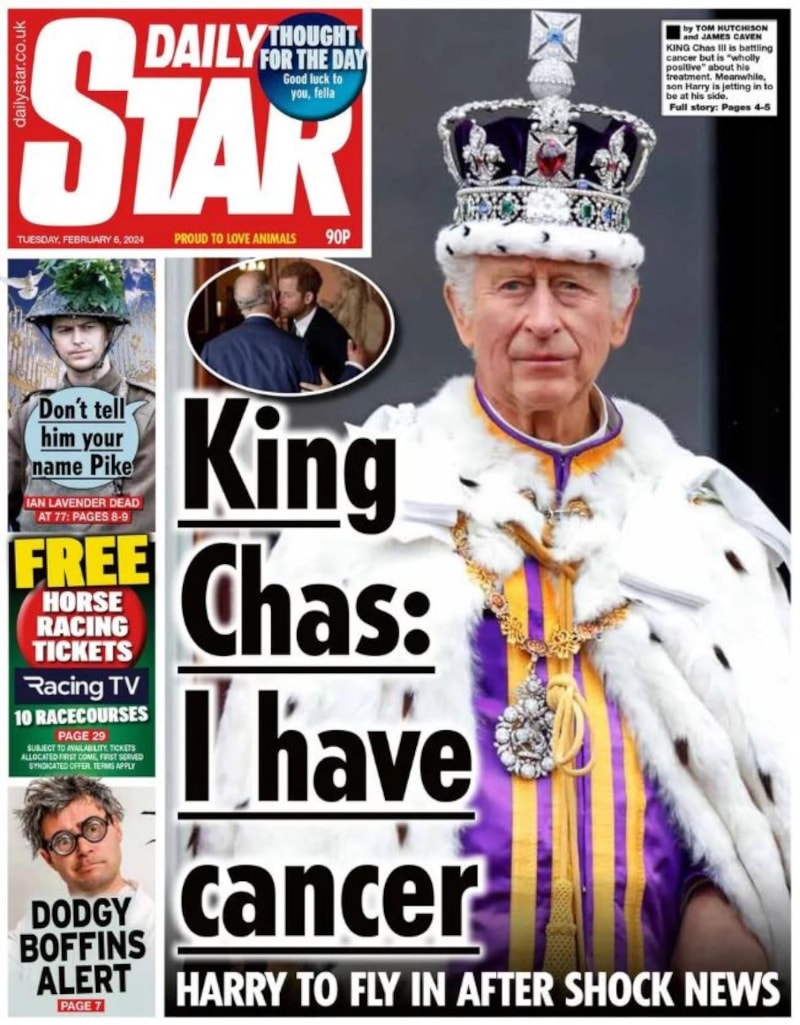 Star ve Telegraph gazeteleri de "Kral kanser oldu" manşetini atarken, Charles'ın "iyimser" olduğunu söylediği bilgisi paylaşıldı.