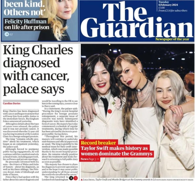 The Guardian, Buckingham'ın açıklamasını alıntılayarak, "Kral Charles'a kanser teşhisi konuldu." dedi.