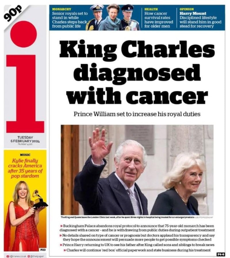Kral Charles'ın halka el salladığı anlara ilişkin bir kareyi yayınlayan "i" adlı gazete, kanser teşhisi haberini duyurdu.