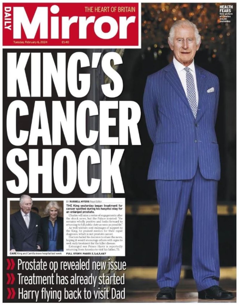 "Kral'ın kanser şoku" manşetini atan Mirror, tedavinin başladığına ve Harry'nin İngiltere'ye geri döneceğine ilişkin bilgileri ilk sayfadan aktardı.