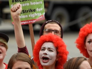 İngiltere'de McDonald's çalışanları grevde. Başkent Londra'da bulunan parlamento binası önünde toplanan iki şubenin çalışanları özlük haklarının yetersiz oluşunu protesto ettiler.