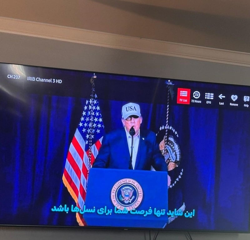 Yayın kesintisi sırasında ABD Başkanı Donald Trump ile İsrail Başbakanı Binyamin Netanyahu'nun İran halkına hitaben yaptığı konuşma Farsça altyazıyla ekrana getirildi.