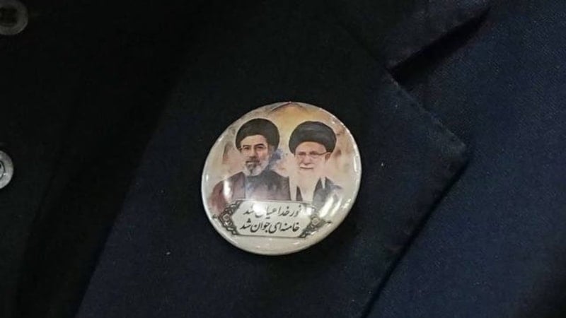 İran heyetinin taktığı rozetlerde Ali Hamaney ve oğlu Mücteba Hamaney'in fotoğraflarının olduğu görüldü.