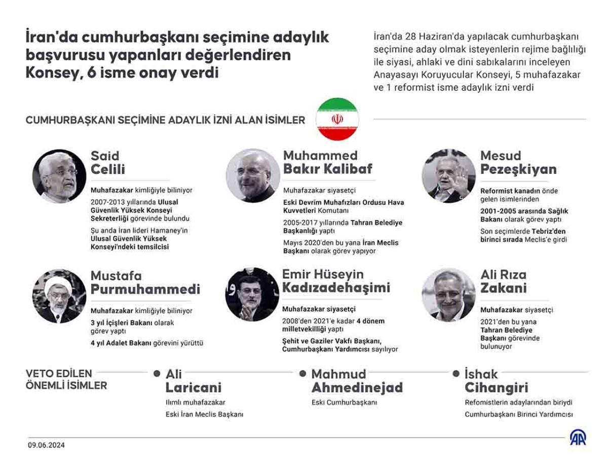 Aday olmak isteyenlerin rejime bağlılığı ile siyasi, ahlaki ve dini sabıkalarını inceleyen Anayasayı Koruyucular Konseyi, 5 muhafazakar ve 1 reformist isme adaylık izni verdi.