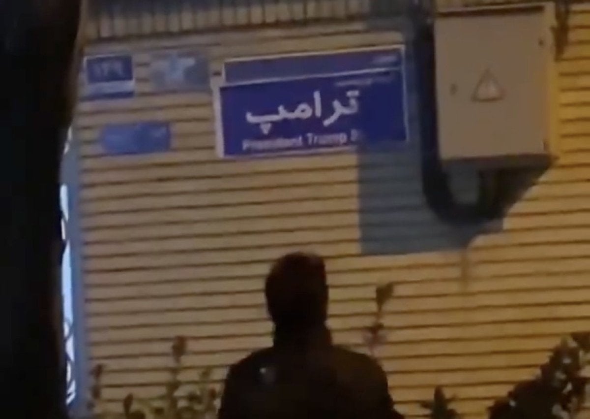 Elinde Farsça ve İngilizce 'Başkan Trump Sokağı' yazan bir afişi orijinal sokak tabelası üzerine yapıştıran göstericinin o anları dikkat çekti.