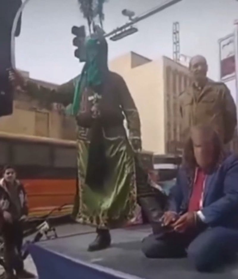 İran’da kamuya açık bir alanda gerçekleştirilen gösteride, ABD Başkanı Donald Trump’ı temsil ettiği belirtilen bir figür üzerinden sembolik bir sahne canlandırıldı.