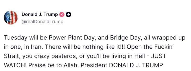Trump açıklamasında "Salı günü İran’da hem Santral Günü hem de Köprü Günü olacak, ikisi bir arada. Bunun gibisi olmayacak!!!