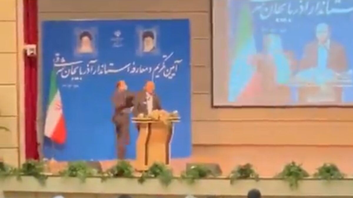 İçişleri Bakanı Ahmed Vahidi’nin de katıldığı törende sahneye çıkan Rezevi, konuşma yaptığı sırada tokatlı saldırıya uğradı.