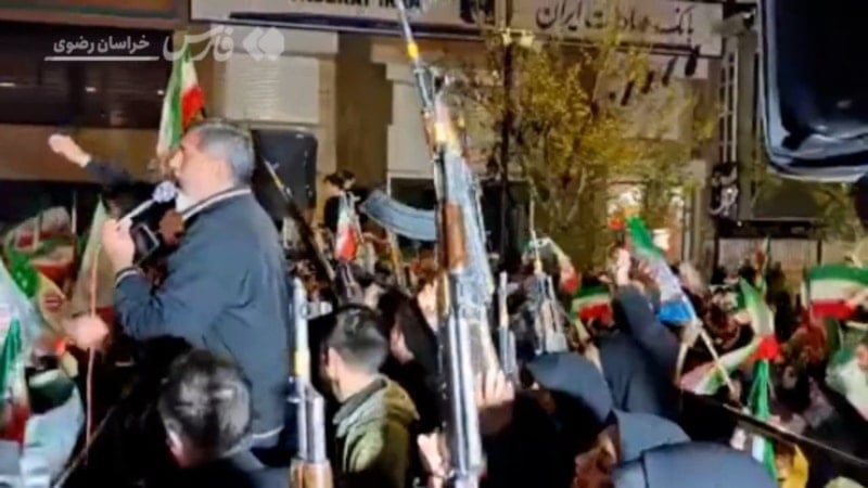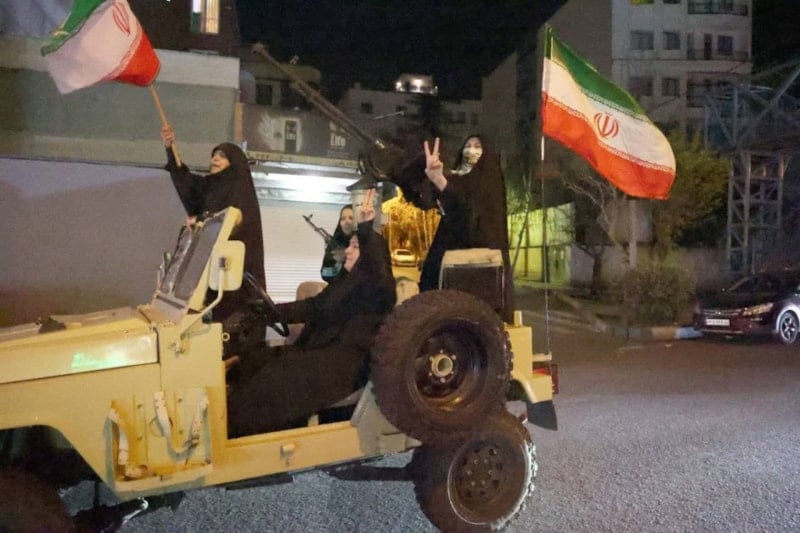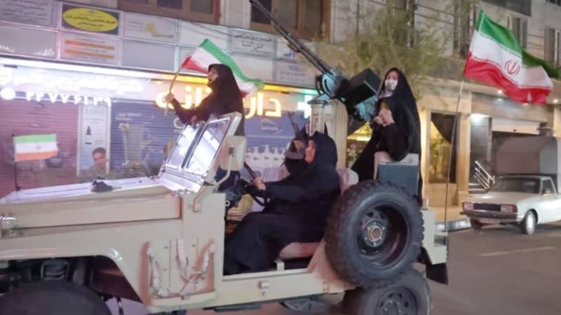Tahran'da İranlı kadınlar, bir arabanın üzerinde silahlarla geçit töreni yaptı. Tahran'da akşam saatlerinde çatışmaların başladığı günden bu yana destek gösterileri düzenleniyor.