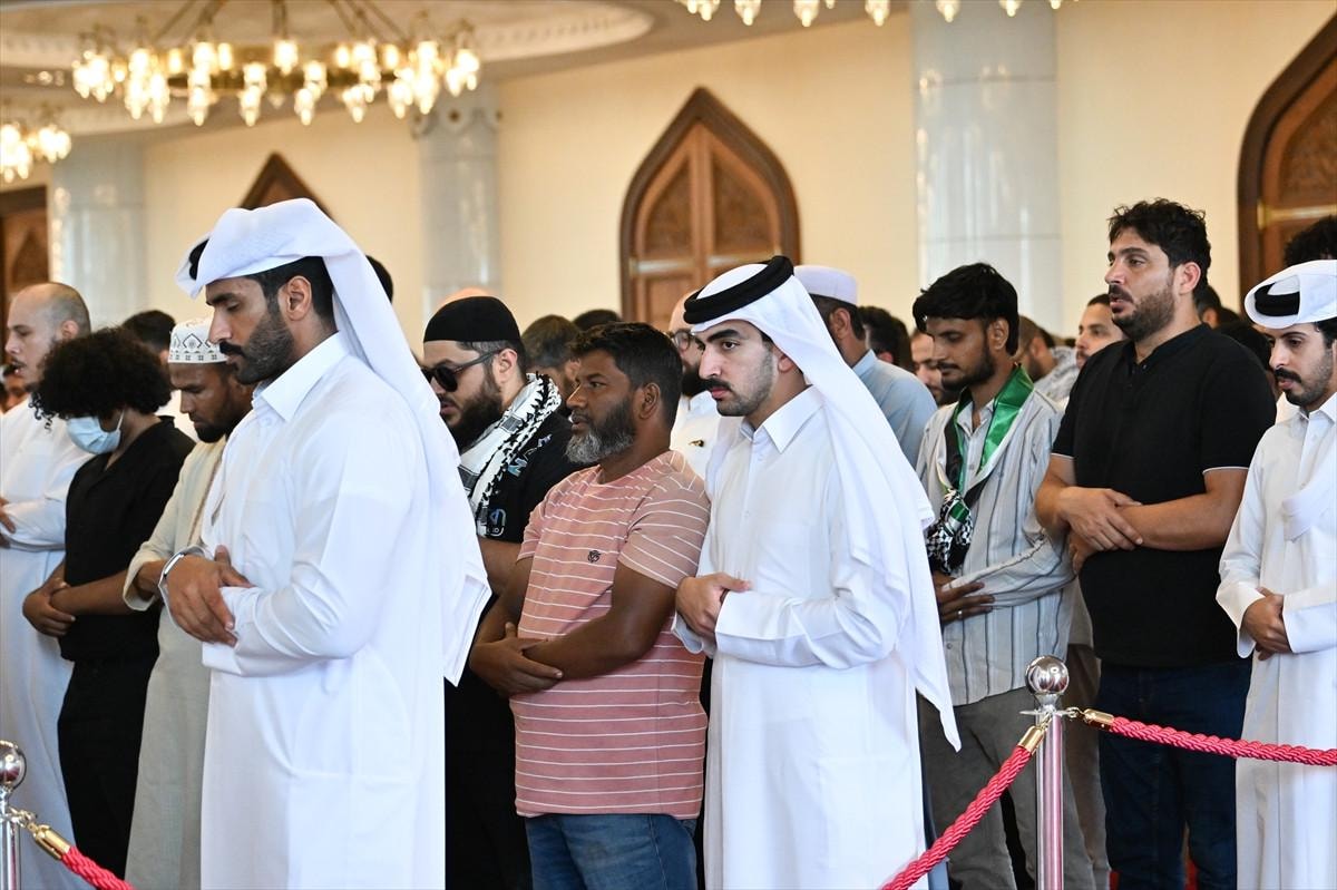 Dünya Müslüman Alimler Birliği Genel Başkanı Ali Muhyiddin el-Karadaği'nin kıldırdığı cenaze namazına; Katar Emiri Şeyh Temim bin Hamed Al Sani’nin yanı sıra TBMM Başkanı Numan Kurtulmuş, Cumhurbaşkanı Yardımcısı Cevdet Yılmaz, Dışişleri Bakanı Hakan Fidan, MİT Başkanı İbrahim Kalın, siyasi partilerden temsilciler ve milletvekilleri de katıldı.
