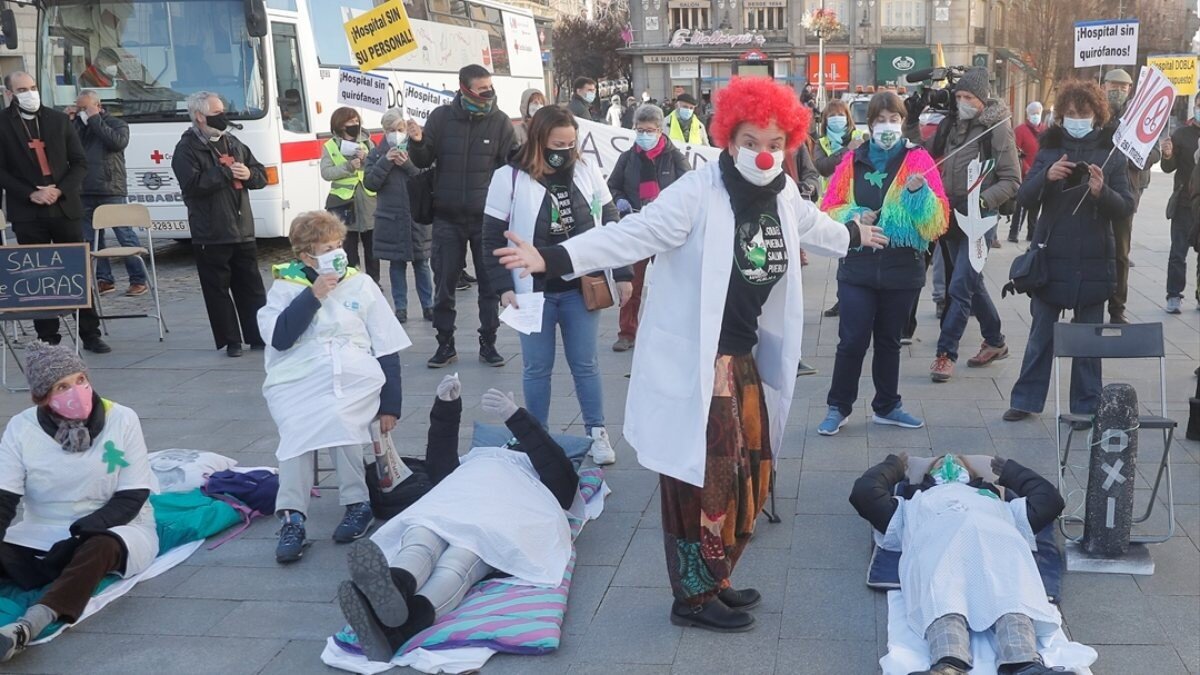 Puerta del Sol Meydanı'nda toplanan bir grup sağlık çalışanı, "Sağlık Büyük Sirki" başlığı altında, tiyatro oyununa benzer bir gösteri organize etti.
