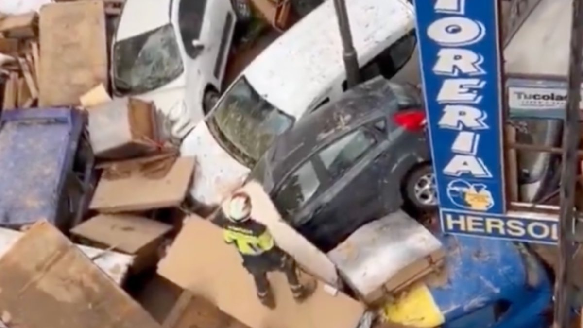 O araçların üzerine çıkan kurtarma ekiplerinden birinin görüntüsü de yaşanan felaketin acı tablosunu gösteriyor.
