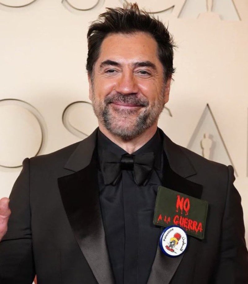 Javier Bardem, Oscar’a 2003 yılında taktığı 'Savaşa hayır' ve Filistinlilerin sembolü ‘Hanzala’ rozetleriyle katıldı.