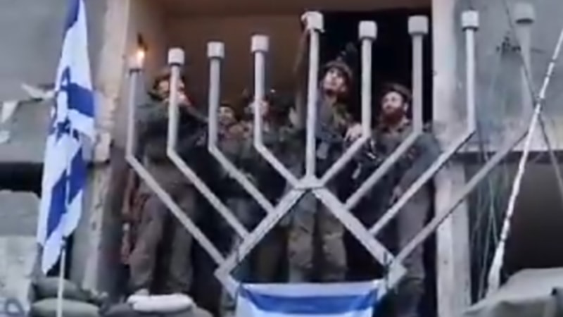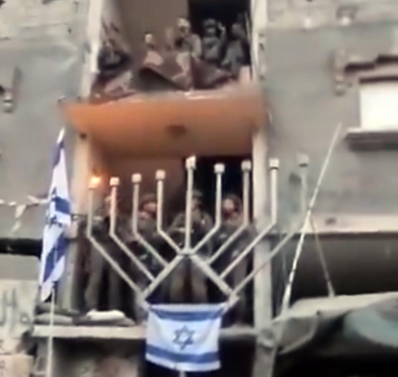 İsrail ordusu mensupları, şimdi ise işgal ettikleri bir binaya çıkarak Hanuka Bayramı'nı kutladı.