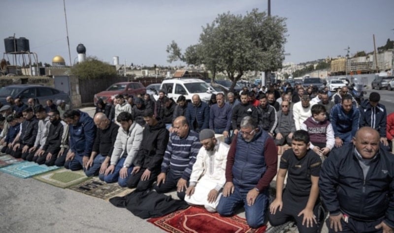 İsrail'in İran'a saldırıları bahane göstererek 1967'de Doğu Kudüs'ün işgalinden bu yana ilk kez bir bayram namazında Mescid-i Aksa'nın kapatılmasına tepki gösteren Filistinliler, Mescid-i Aksa'ya çıkan yollarda toplanarak yoğun kalabalıklar oluşturdu.
